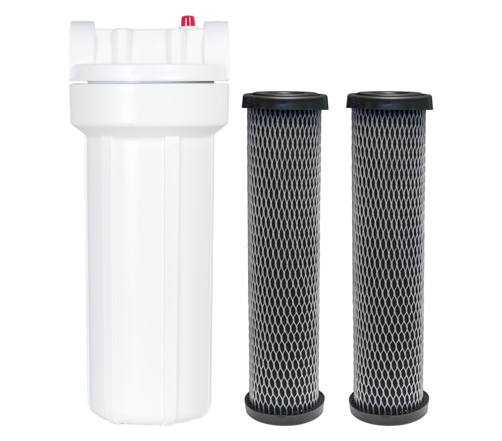 Water filter with two (2) replaceable cartridges installs easily and filters water before it enters your soda fountain system. Reduces sand, soil, silt, sediment, dirt, rust and chlorine in your drinking water for improved taste and odor.