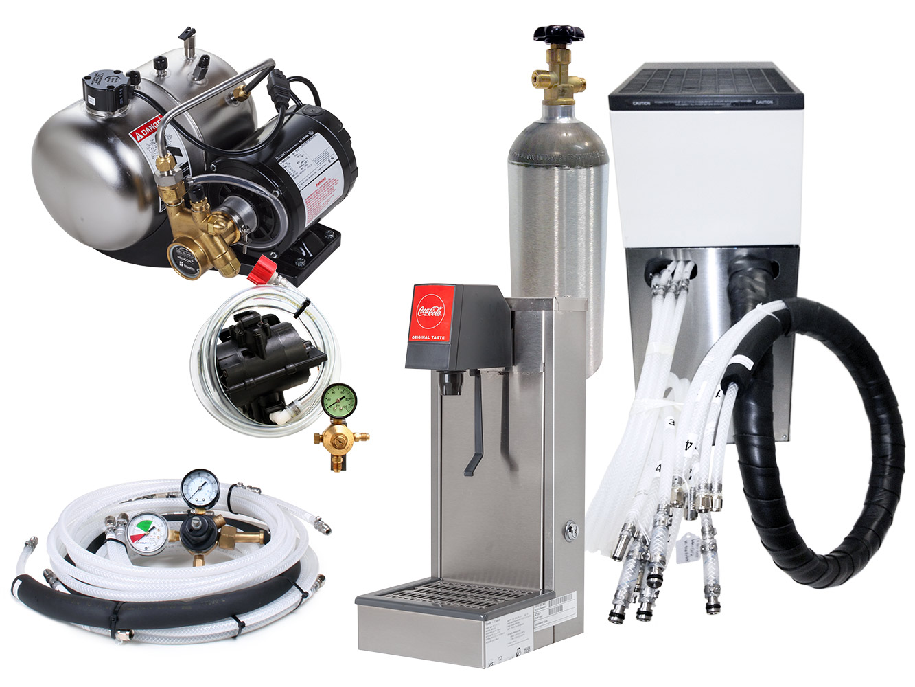 Also included: One (1) syrup pump and holder with BIB hosing and connector, primary & secondary CO2 regulators, high pressure hosing, carbonator, remote chiller, and CO2 tank.