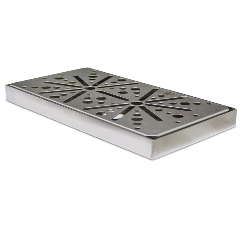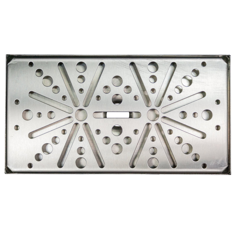 Draft arm drain tray (9.5" x 5") constructed of stainless steel. Removable cup rest to easily maintain sanitation. Includes 4" x 0.75" threaded brass shank, gasket and lock nut for mounting to surfaces up to 3" thick. Also includes 0.5" barbed fitting to attach drain line.