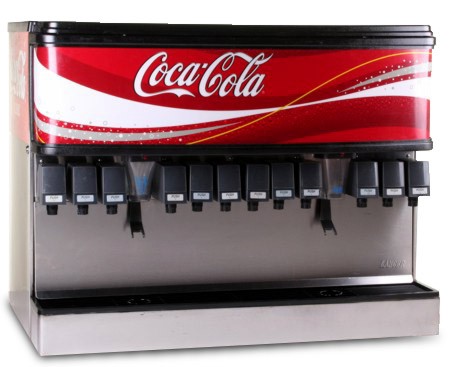 Complete twelve (12) flavor ice and beverage soda fountain system. Ideal for self-serve applications. The system, with built-in ice bin (holds approx. 300 lb of ice), has built-in cold plate and is equipped with a lever-activated ice dispenser. This method of cooling is very efficient and easily maintains product quality during high demand. Dispenser features an attractive marquee and stainless steel construction.