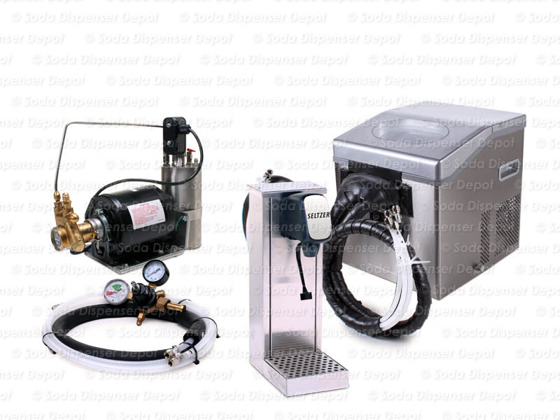Complete, remanufactured, seltzer tower soda fountain system with new compact remote chiller. This complete system is designed for home or office use. The stainless dispenser is compact in size and blends in a variety of settings without eating up valuable counter space.