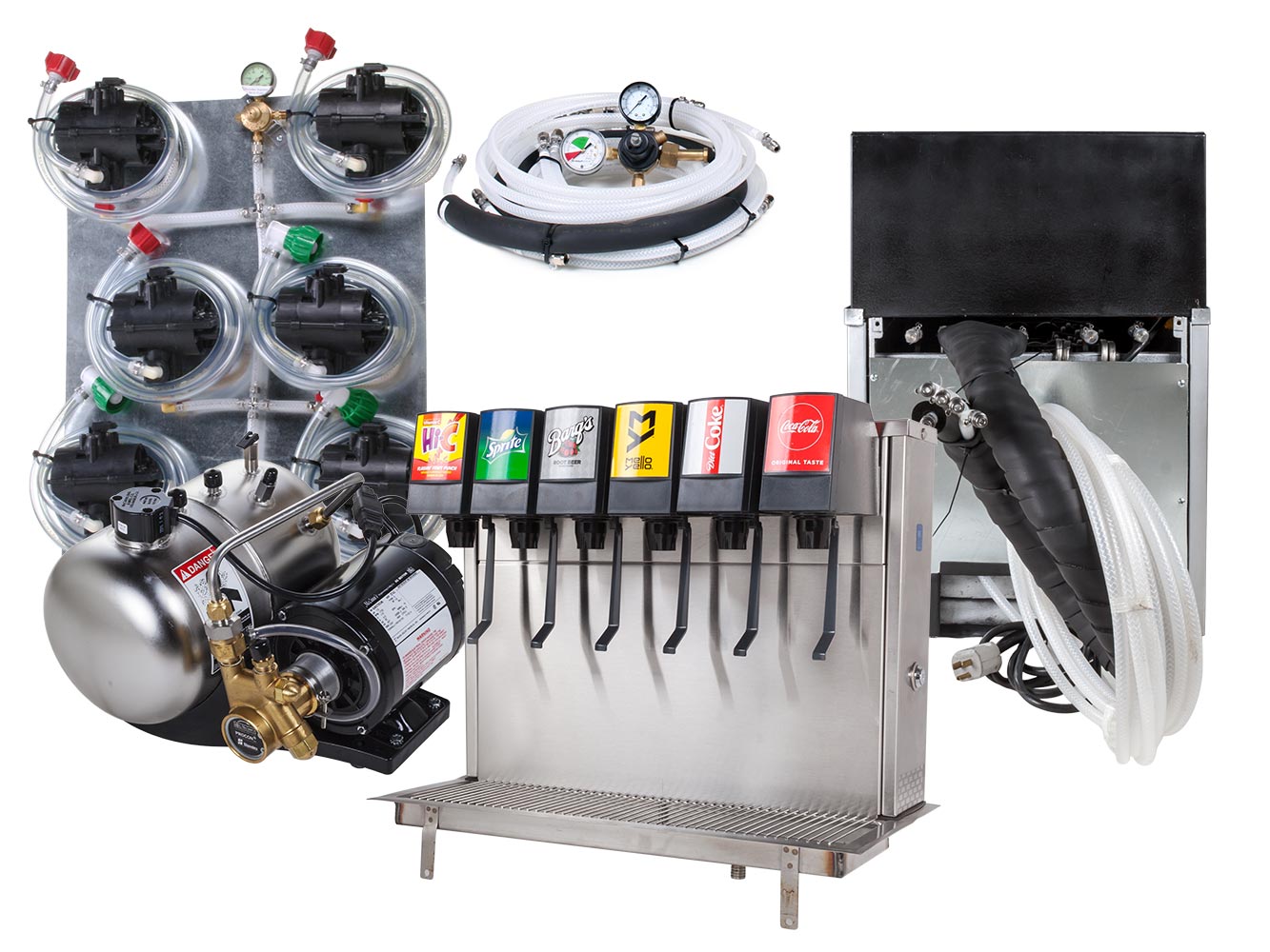 Also included: Six (6) syrup pumps and mounting panel with BIB hosing and connectors, primary & secondary CO2 regulators, high pressure hosing, carbonator, and remote chiller.