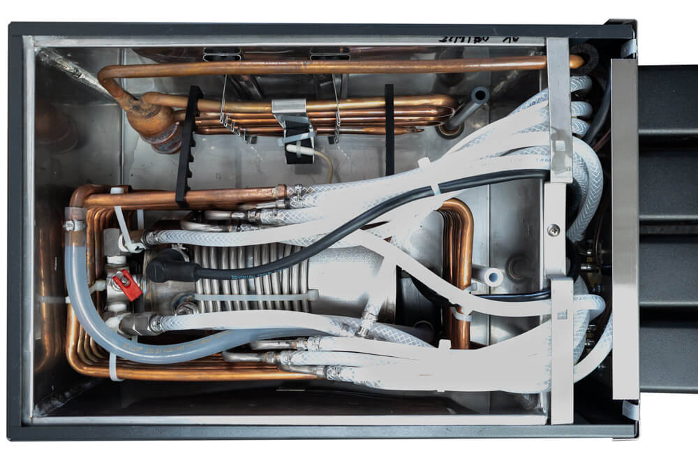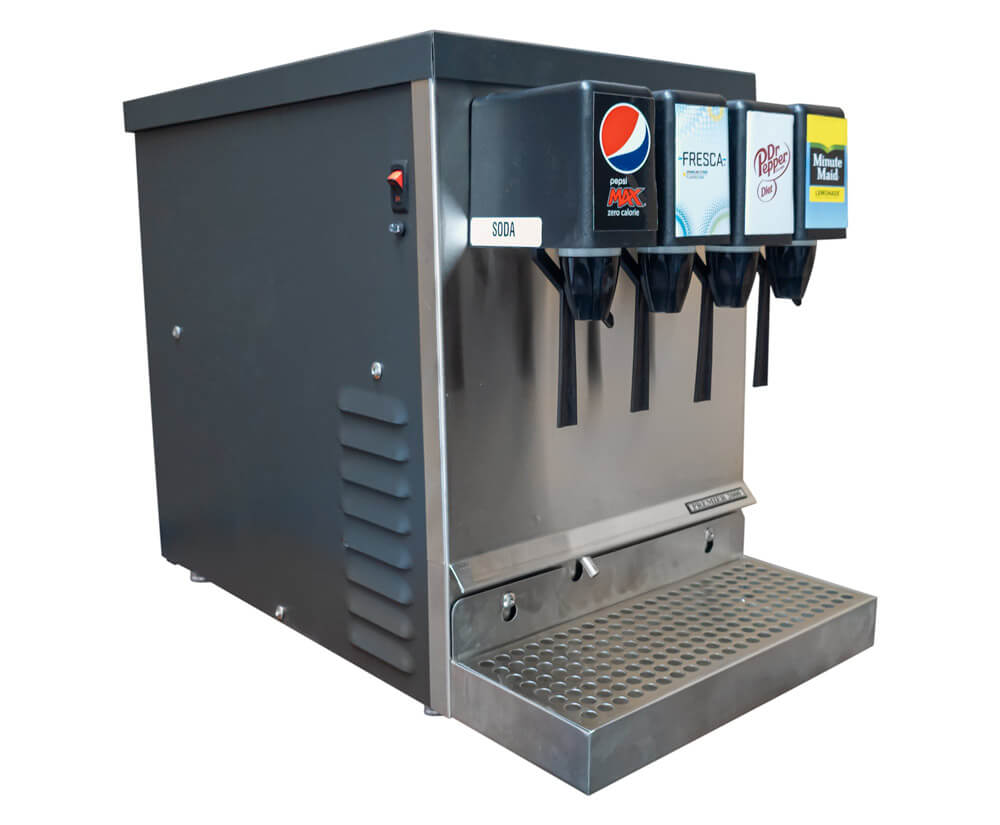 Complete four (4) flavor compact counter electric soda fountain system. This system features built-in refrigerated cooling and cold carbonation for the highest product quality. This type of heat transfer cools a water bath that the soda water and syrup lines run through, eliminating the need for a cold plate or ice.