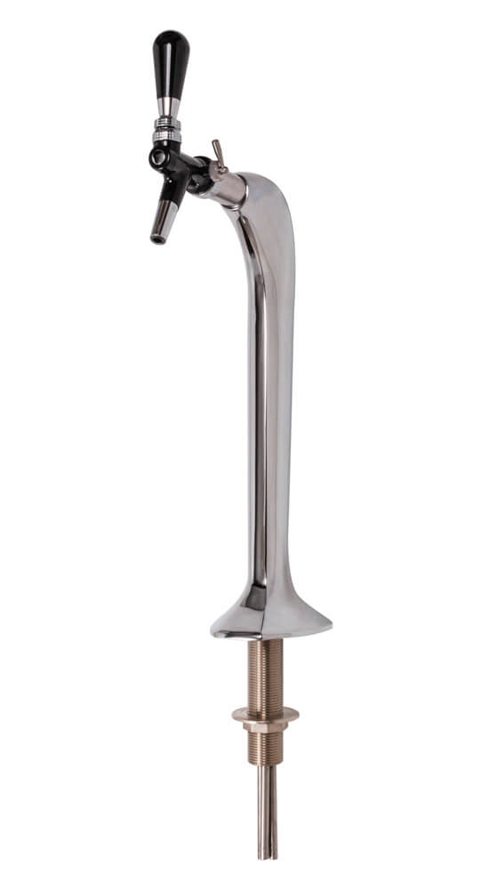 Complete seltzer draft arm soda fountain system with flow control and compact remote chiller. This complete system is designed for home or office use. The draft arm stands 18.75 inches tall, is made of brass with a brilliant chrome-plated finish and stainless steel piping for no corrosion with carbonic acids. A 4.5-inch brass shank enables mounting on the thinnest to thickest surfaces. Includes black plastic faucet knob. Compatible for recirculation chilling. Dispenses seltzer only.