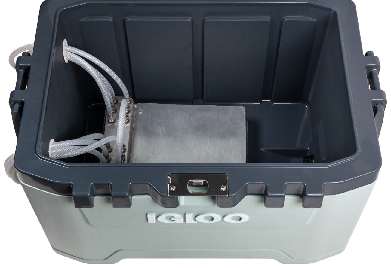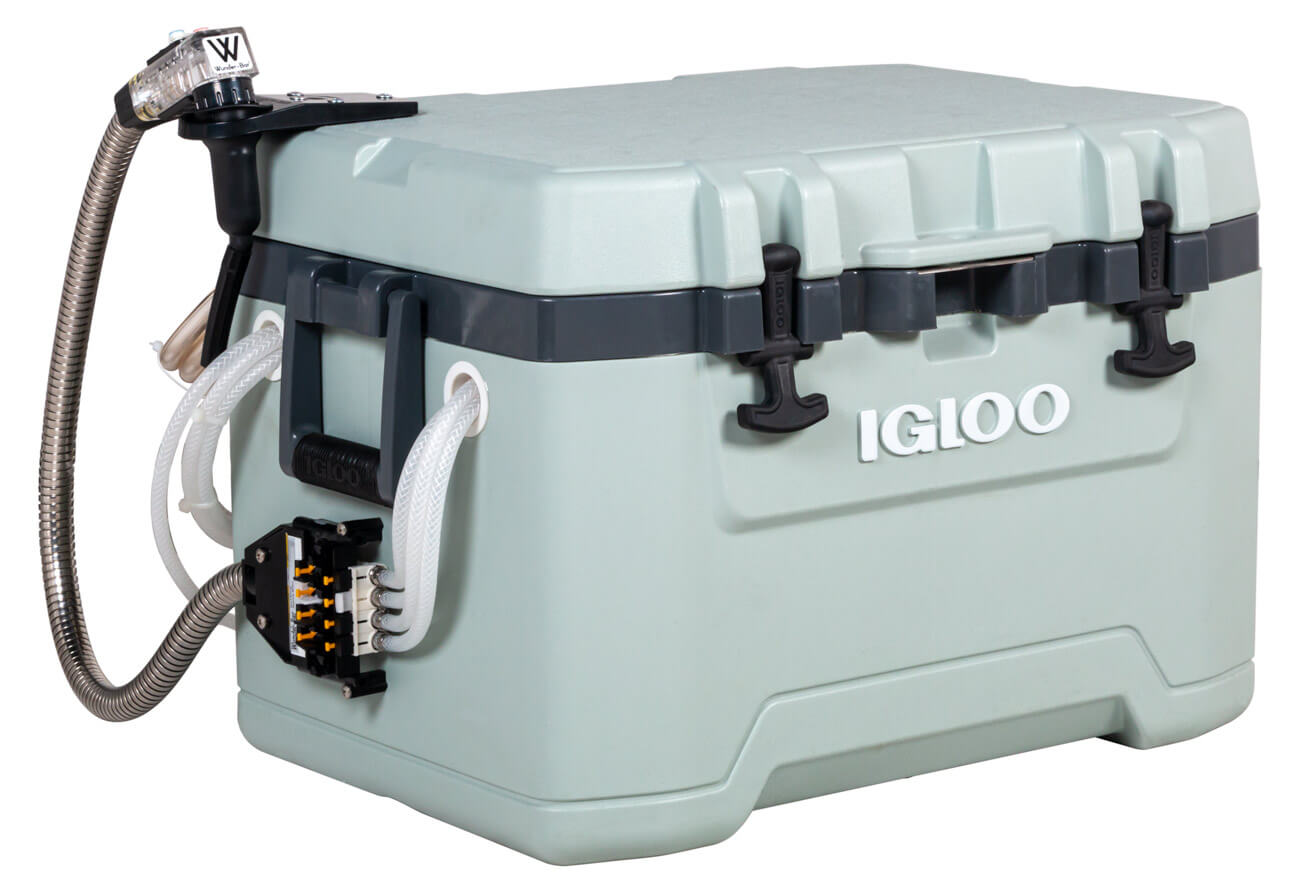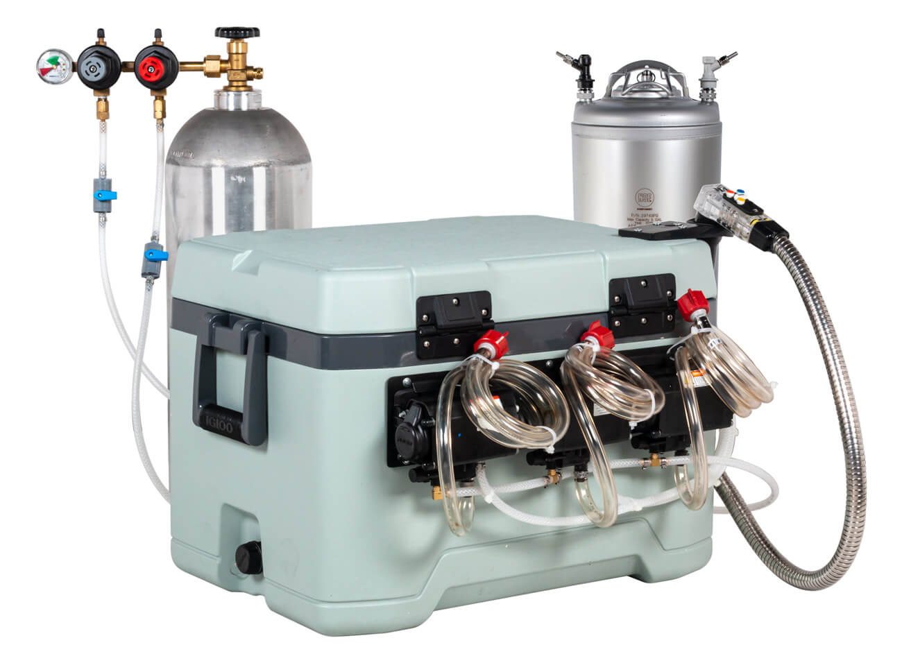Complete, portable, non-electric, three (3) flavor soda gun fountain system with cold plate. Great for tailgating, parties, and more! Featuring a 50-quart Igloo® cooler with extra thick 1.5" foam walls and insulated lid, leak-resistant drain plug, comfort grip handles, and integrated bottle opener.