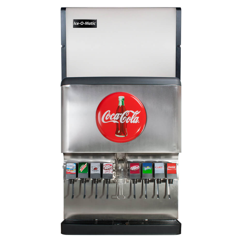 Complete, remanufactured, eight (8) flavor ice and beverage soda fountain system with cold carbonation and remanufactured Ice-O-Matic ice maker (ice maker does not include power cord). Ideal for self-serve applications. The system, with built-in ice bin (holds approx. 250 lb of ice), has built-in cold plate and is equipped with a lever-activated ice dispenser. This method of cooling is very efficient and easily maintains product quality during high demand. Dispenser features an attractive marquee and stainless steel construction.